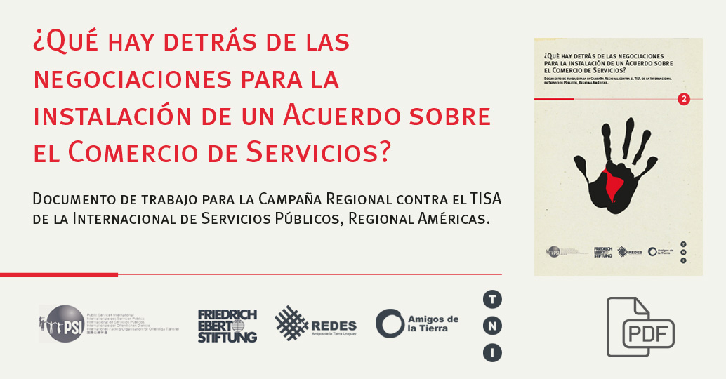 Uruguay aún no ha descartado, en cambio, su adhesión al TPP. Como parte de los continuos esfuerzos de REDES – AT para aportar información y análisis de los cambios del nuevo régimen comercial, difundimos este lunes un nuevo insumo reflexivo titulado “¿Qué hay detrás de las negociaciones para la instalación de un Acuerdo sobre el Comercio de Servicios?”. Se trata de un documento de trabajo para la Campaña Regional contra el TISA, de la Internacional de Servicios Públicos (ISP), Regional Américas. La autora es la licenciada en Relaciones Internacionales Viviana Barreto, del equipo de REDES – AT.