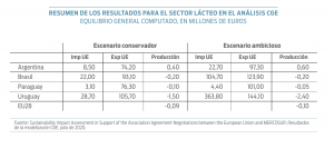 Las exportaciones de productos lácteos de la UE al Mercosur aumentarían 91% en el escenario conservador y 121% en el más ambicioso, pero las exportaciones de quesos podrían tener un incremento aún mayor al reconocerse la denominación de origen en los países del Mercosur. Entretanto, el aumento de las exportaciones del Mercosur a la UE sería de 18% en el escenario conservador y 165% en el ambicioso. Pero el Mercosur parte de una base reducida y la UE parte de una base mayor, por lo que el incremento absoluto de las exportaciones de la UE al Mercosur será mucho mayor. Además, el estudio advierte que una mayor expansión de las exportaciones del Mercosur dependerá de la mejora de las condiciones sanitarias en el bloque, así como del bienestar animal y otros elementos que hacen a la calidad de la producción. El estudio concluye que Uruguay será el país más afectado por el acuerdo, con una caída de la producción de entre 1,5% en el escenario conservador y 2,4% en el escenario más ambicioso, en el que se alcanza una liberalización total.