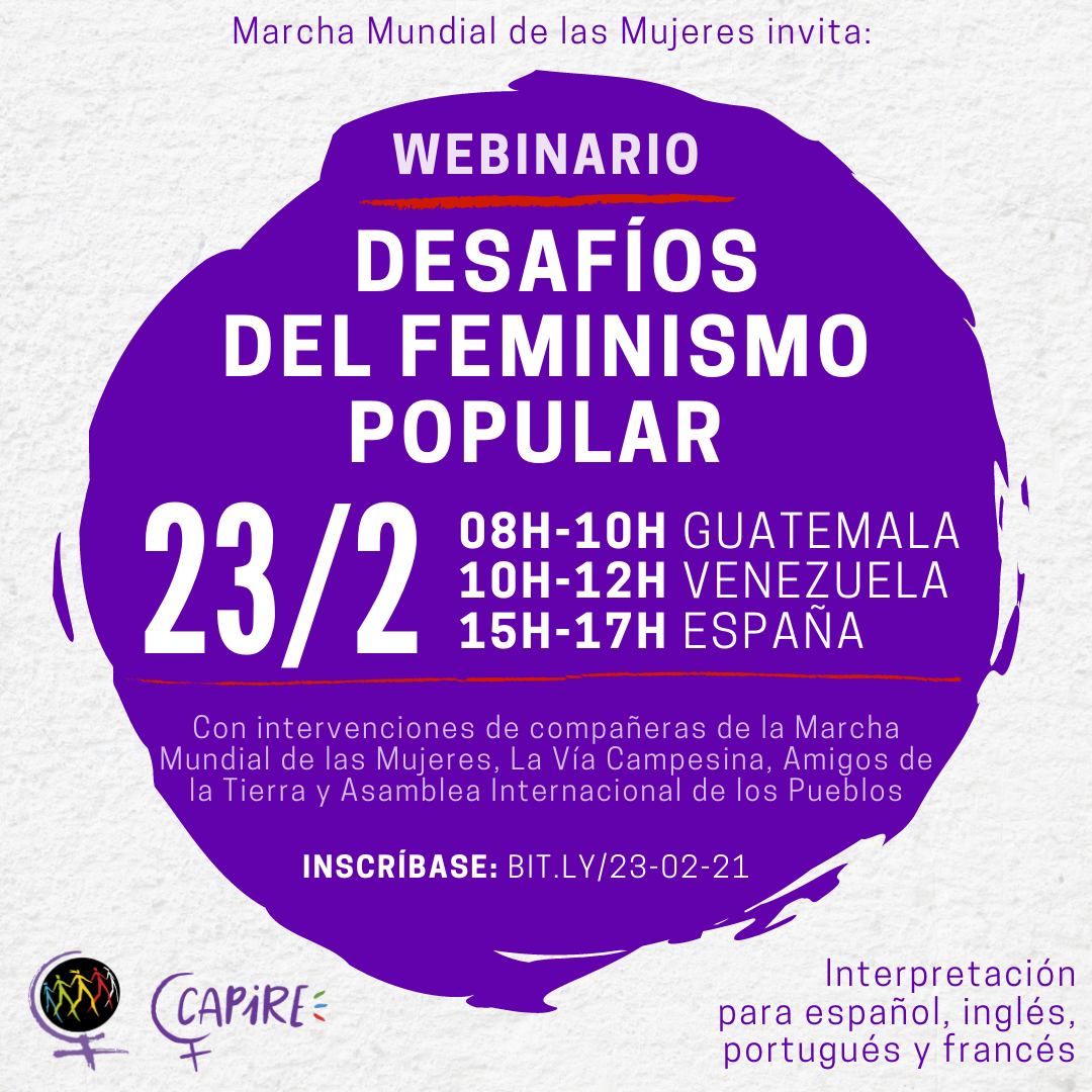 Este martes 23/2 a las 11 horas, les invitamos al Webinario público internacional “Desafíos del feminismo popular”.
